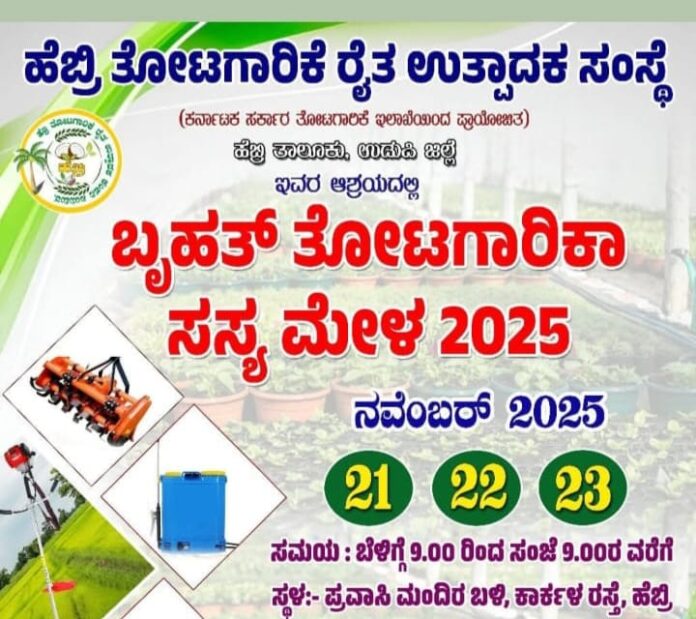 ಹೆಬ್ರಿ ತೋಟಗಾರಿಕಾ ರೈತ ಉತ್ಪಾದಕ ಸಂಸ್ಥೆ ವತಿಯಿಂದ ಹೆಬ್ರಿಯಲ್ಲಿ ನವೆಂಬರ್ 21ರಿಂದ 23 ವರೆಗೆ ಮೂರು ದಿನಗಳ ಕಾಲ ತೋಟಗಾರಿಕಾ ಸಸ್ಯ ಮೇಳವು ಹೆಬ್ರಿ ಪ್ರವಾಸಿ ಮಂದಿರದ ಬಳಿ ನಡೆಯಲಿದೆ. ಸಸ್ಯ ಪ್ರದರ್ಶನ ಮತ್ತು ಮಾರಾಟ ವಸ್ತು ಪ್ರದರ್ಶನ , ಕೃಷಿ ಯಂತ್ರೋಪಕರಣಗಳ ಪ್ರದರ್ಶನ, ಆಹಾರ ಮೇಳವನ್ನು ಹಮ್ಮಿಕೊಳ್ಳಲಾಗಿದೆ.