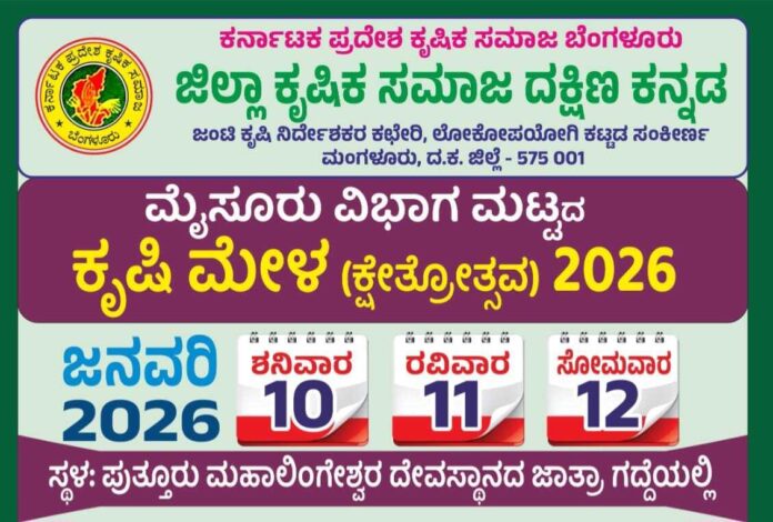 ಕೃಷಿಬಿಂಬ ಸುದ್ದಿ-(ಪುತ್ತೂರು) : ಕರ್ನಾಟಕ ಕೃಷಿ ಸಮಾಜ ಬೆಂಗಳೂರು, ಜಿಲ್ಲಾ ಕೃಷಿಕ ಸಮಾಜ ದಕ್ಷಿಣ ಕನ್ನಡ ಇದರ ಸಂಯೋಜನೆಯಲ್ಲಿ ಮೈಸೂರು ವಿಭಾಗ ಮಟ್ಟದ ಕೃಷಿ ಮೇಳವು ಜನವರಿ 10 ರಿಂದ 12ರವರೆಗೆ ಮೂರು ದಿನಗಳ ಕಾಲ ಪುತ್ತೂರಿನ ಶ್ರೀ ಮಹಾಲಿಂಗೇಶ್ವರ ದೇವಸ್ಥಾನದ ಜಾತ್ರಾ ಗದ್ದೆಯಲ್ಲಿ ನಡೆಯಲಿದೆ