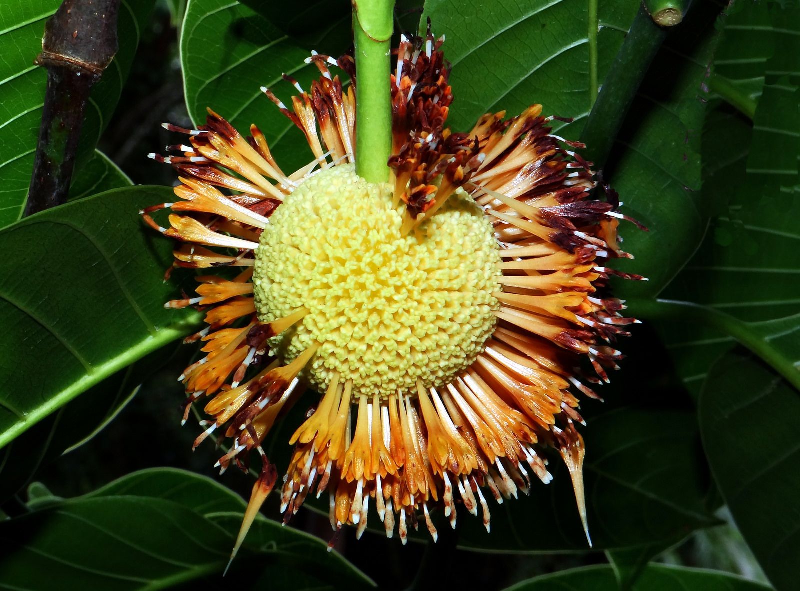 ಇದರ ಹೂವುಗಳು ಸುಮಾರು 5.5 ಸೆಂ.ಮೀ ವ್ಯಾಸದದಟ್ಟವಾದ, ಗೋಳಾಕಾರದಲ್ಲಿ ಇರುತ್ತವೆ. ಕದಂಬದ ಹಣ್ಣುಗಳು ಚಿಕ್ಕದಾದ, ತಿರುಳಿರುವ ಕ್ಯಾಪ್ಸೂಲ್ಗಳಂತೆ ಇದ್ದು, ಸುಮಾರು 8೦೦೦ ಬೀಜಗಳನ್ನು ಒಳಗೊಂಡು ತಿರುಳಿರುವ ಹಳದಿ-ಕಿತ್ತಳೆ ಬಣ್ಣದಲ್ಲಿರುತ್ತದೆ. ಹಣ್ಣುಗಳು ಬಲಿತಾಗ ಹಣ್ಣಿನಿಂದ ಬೀಜಗಳು ಬೇರ್ಪಟ್ಟು ನಂತರ ಅವು ಗಾಳಿ ಅಥವಾ ಮಳೆಯಿಂದ ಚದುರಿ ಬೇರೆಡೆ ಬೀಜ ಪ್ರಸರಣಗೊಂಡು ಮತ್ತೆ ಮಣ್ಣಿಗೆ ಸೇರಿ ಮೊಳಕೆ ಒಡೆದುಗಿಡವಾಗಿ ಮರವಾಗುತ್ತದೆ.ಬಂಗಾರದ ಬಣ್ಣದ ಈ ಹೂವಿನ ಮಧ್ಯದಲ್ಲಿ ಬಿಳಿ ಬಣ್ಣದ ದಳಗಳಿದ್ದು, ಮರದ ಬುಡದಿಂದಲೇ ದಟ್ಟವಾದ ಕೊಂಬೆಗಳಿರುತ್ತವೆ. ಕೊಂಬೆಗಳು ಹಳತಾದಂತೆ ಕೊಂಬೆಗಳನ್ನು ಬೀಳಿಸುತ್ತದೆ. ಕೊಂಬೆಗಳು ತುಂಡಾಗಿ ಬಿದ್ದಕೊಂಬೆಯಜಾಗದಲ್ಲೆಲ್ಲಾ ಕಣ್ಣುಗಳ ಆಕಾರಕಾಣಿಸುವುದರಿಂದ ಇದನ್ನು‘ಮಧ್ಯಾರಂಭಿ’ಎಂದೂ ಕರೆಯುತ್ತಾರೆ.